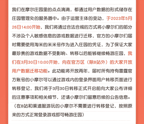 合作结束本就是开发方和代理方双方的事情,,,,降低这件事情对玩家的影响,,,,才是对所有珍视这段童年的摩尔玩家最好的呵护。。。。目前看来,,,,用户完全不用担心后续因无法登录游戏而造成任何数据上的损失,,,,只要及时进行账号转移,,,就可以好好保留、、延续在庄园的痕迹和回忆,,,,继续在庄园里做快乐的红鼻子小鼹鼠。。。