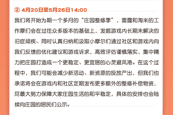 合作的结束并不意味着这个童年IP的结束,,,,对于《摩尔庄园》手游而言,,这是一个新阶段的开始。。。。后续游戏内将开启庄园重构计划,,,,会就以往遗留下来的BUG进行集中修复,,,并在游戏内和社区定期发布更多补偿物资。。