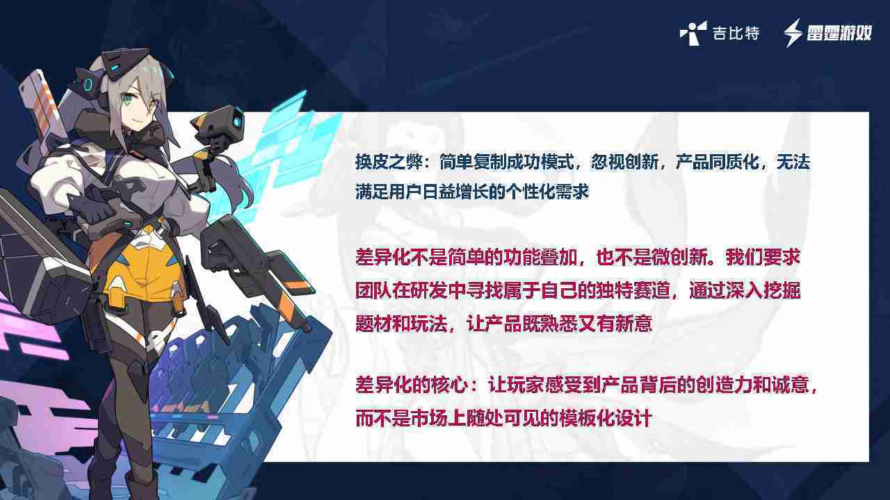在我们内部是这么定义差异化的。。。首先,,,差异化不是简单的功能叠加,,,更不是换皮。。。只是换皮,,,产品无法提供有效的市场价值。。。。内部经常说差异化的产品不是为了迎合市场,,,,而是找到一个自己独特的表达方式,,,,在研发中找到属于自己的细分赛道和独特赛道,,,前提是需要对这个题材有足够的深入、、、、挖掘,,,对玩法有足够深入的理解,,,让产品看起来既熟悉又有新意。。。。